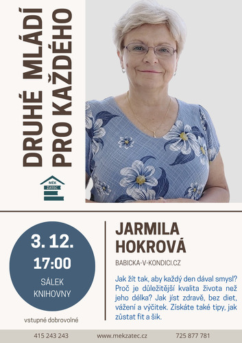 Přednáška Jarmily Hokrové Jak žít, aby každý den dával smysl? Proč je důležitější kvalita života než jeho délka? Jak jíst zdravě, bez diet, vážení a výčitek. Tipy, jak zůstat fit a šik.