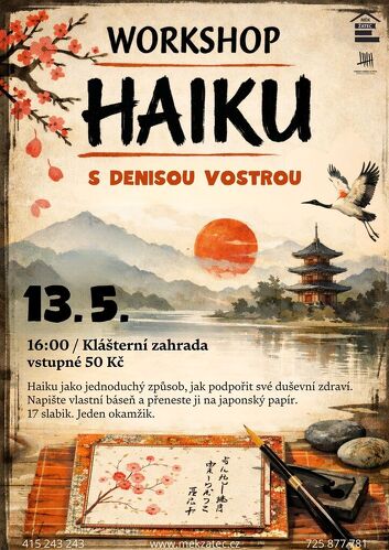 Workshop haiku s Denisou Vostrou. Napište vlastní báseň a přeneste ji na japonský papír. 17 slabik. Jeden okamžik.