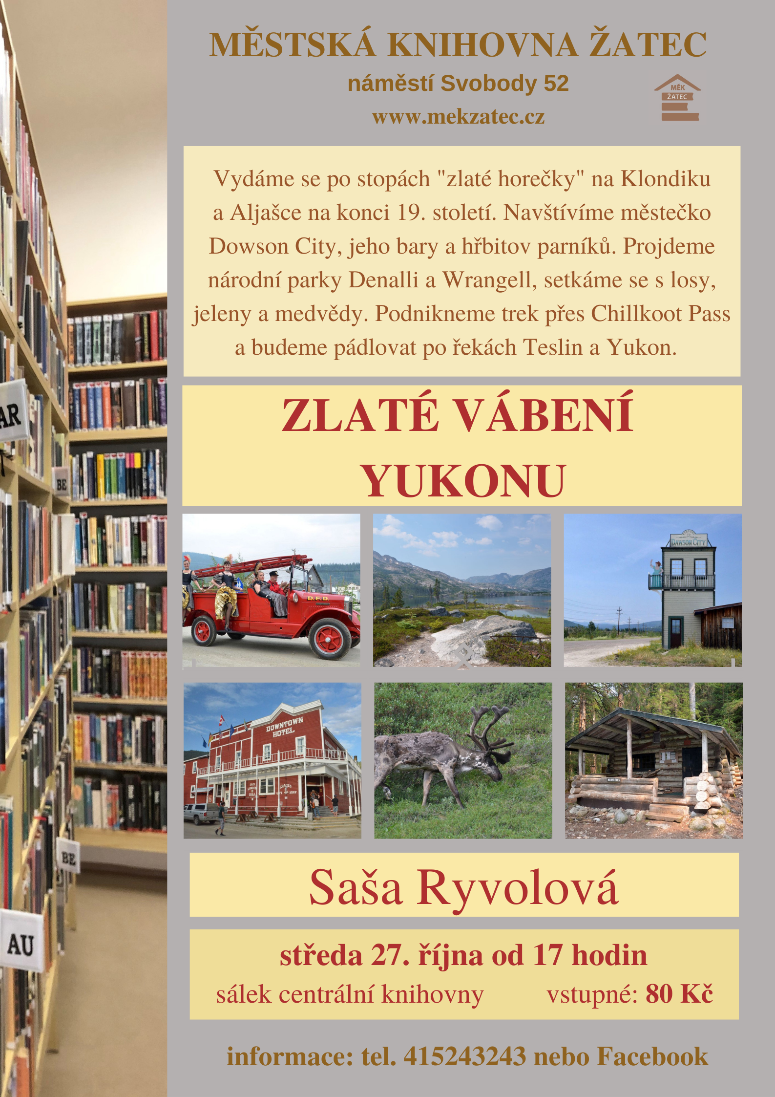 Cestopisná beseda se Sašou Ryvolovou. Společně se vydáme po stopách "zlaté horečky" na Klondiku a Aljašce na konci 19. století. Navštívíme městečko Dowson City, jeho bary a hřbitov parníků. Projdeme národní parky Denalli a Wrangell, setkáme se s losy, jeleny a medvědy...